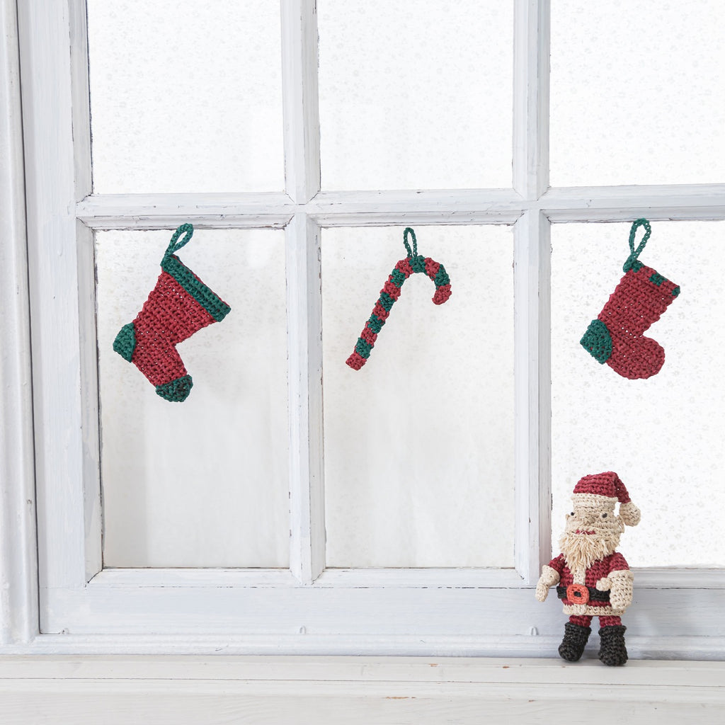 全て手編みのサンタさんは手のひらにも乗るぐらいのかわいさですが、立派なヒゲをはやし、ベルトをしっかり締め、黒ブーツで決めています。 ソックスとステッキはX'masオーナメントの定番です。小さなソックスですが、中にプレゼントを入れることもできます。